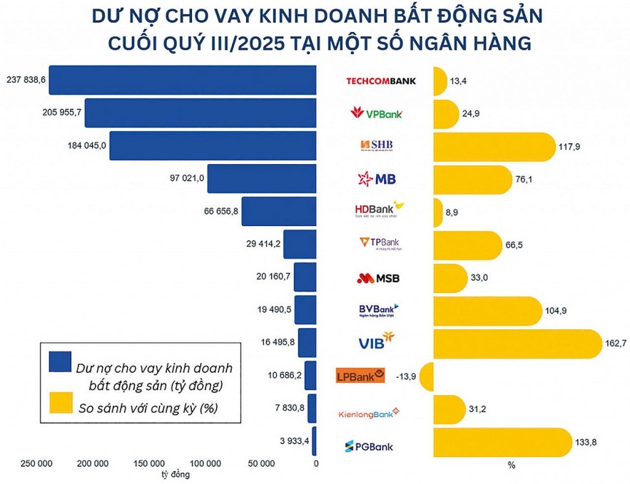 | Dư nợ cho vay kinh doanh bất động sản của nhiều ngân hàng tăng 3 con số Thống kê từ 12 ngân hàng công bố báo cáo tài chính thể hiện rõ dư nợ cho vay lĩnh vực kinh doanh bất động sản cho thấy, đến cuối quý III/2025, các nhà băng như Techcombank, VPBank, MB... tiếp tục dẫn đầu cho vay kinh doanh bất động sản. Trong đó, Techcombank đạt hơn 237.800 tỷ đồng, tăng 13,4% so với cùng kỳ năm 2024 và tăng tới 27,1% so với cuối năm 2024. Ngân hàng này cũng dẫn đầu dư nợ cho vay kinh doanh bất động sản nhiều năm liên tiếp (trong danh sách những ngân hàng công bố thông tin). VPBank cho vay kinh doanh bất động sản đạt hơn 205.900 tỷ đồng tính đến cuối quý III/2025, tăng 24,9% so với cùng kỳ; MB đạt hơn 97.000 tỷ đồng, tăng 76,1% so với cùng kỳ. Các ngân hàng quy mô tầm trung và nhỏ như BVBank, VIB, PGBank... cũng tăng mạnh dư nợ ở mức 3 con số, từ 104,9% đến 162,7%, song quy mô nhỏ hơn đáng kể. Về tỷ trọng cho vay kinh doanh bất động sản trong tổng dư nợ cho vay khách hàng, Techcombank đứng đầu, với 31%. BVBank, VPBank... cũng nằm trong nhóm cao, với tỷ trọng 23 - 25,3%. Trong khi đó, một số ngân hàng kiểm soát với tỷ trọng thấp hơn như: MSB (khoảng 9,8%), PGBank (8,9%), VIB (4,4%)...
