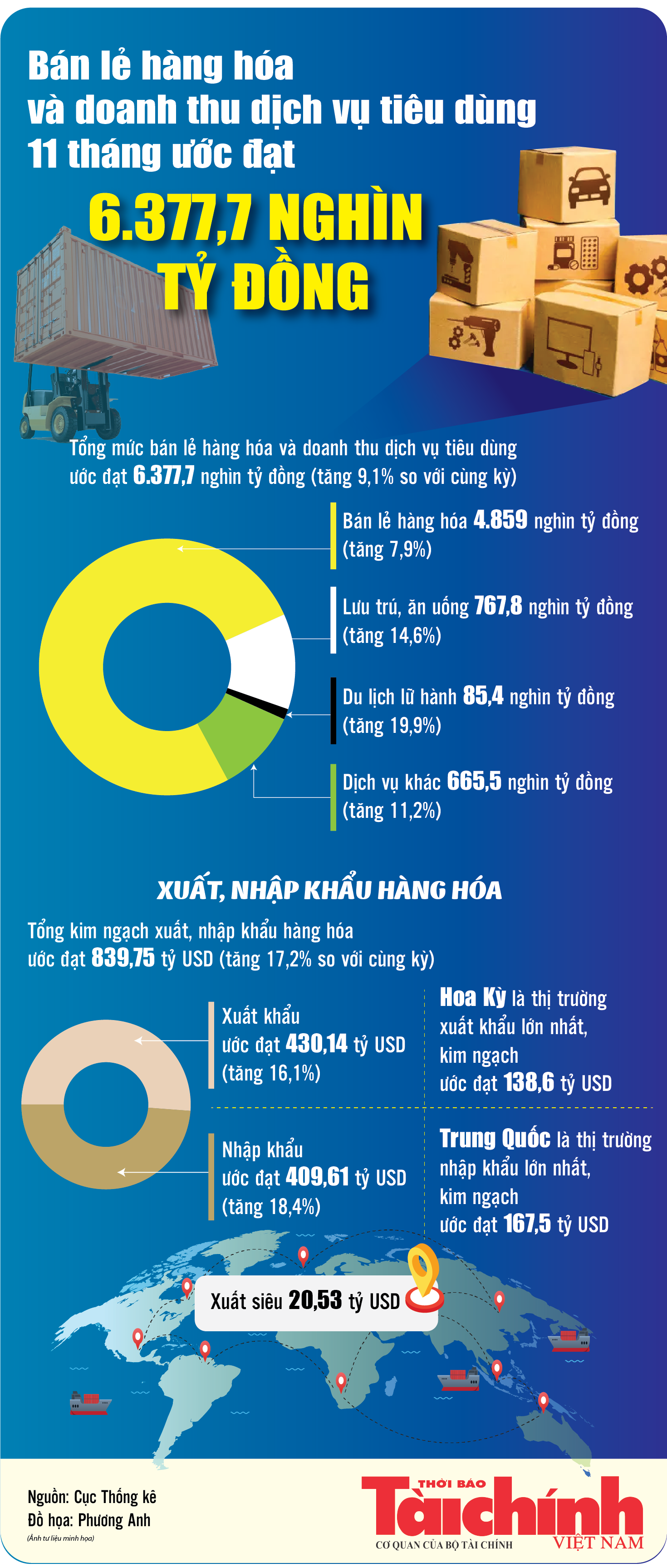 (TBTCO) - Trong tháng 11, tổng kim ngạch xuất, nhập khẩu hàng hóa đạt 77,06 tỷ USD, giảm 5,4% so với tháng trước và tăng 15,6% so với cùng kỳ năm trước. Tính chung 11 tháng năm 2025, tổng kim ngạch xuất, nhập khẩu hàng hóa đạt 839,75 tỷ USD, tăng 17,2% so với cùng kỳ năm trước, trong đó xuất khẩu tăng 16,1%; nhập khẩu tăng 18,4% . Cán cân thương mại hàng hóa xuất siêu 20,53 tỷ USD.