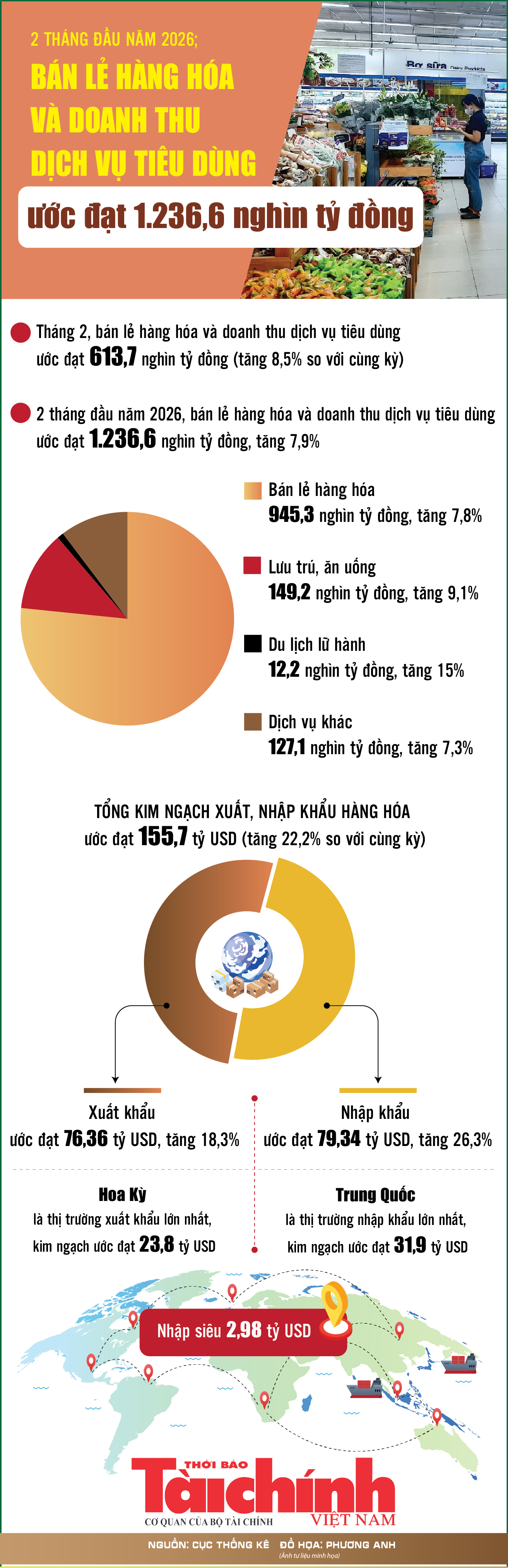 (TBTCO) - Theo số liệu thống kê của Cục Thống kê (Bộ Tài chính), chỉ số giá tiêu dùng (CPI) tháng 2/2026 tăng 1,14% so với tháng trước, tăng 3,35% so với cùng kỳ. Bình quân 2 tháng đầu năm 2026, CPI tăng 2,94% so với cùng kỳ năm trước.