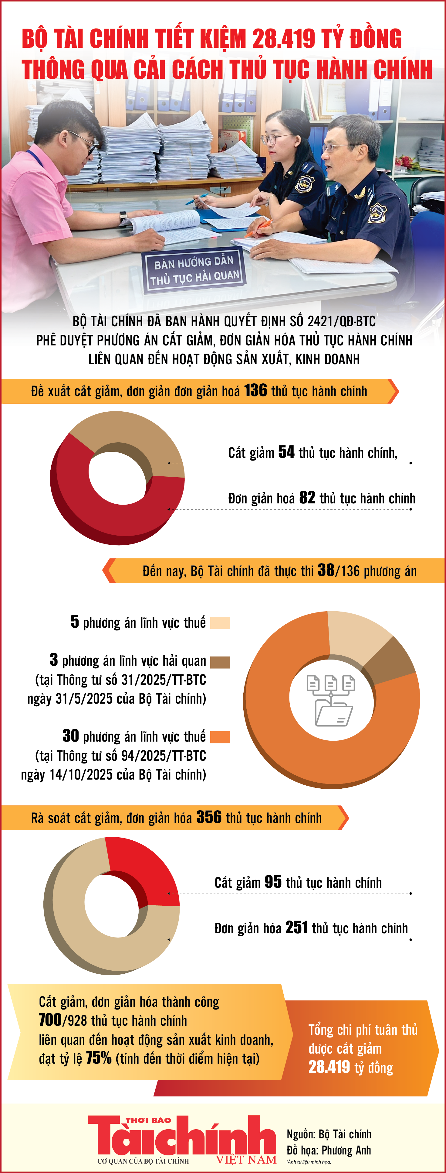 (TBTCO) - Tính đến thời điểm hiện tại, Bộ Tài chính đã thành công cắt giảm, đơn giản hóa 700/928 thủ tục hành chính liên quan đến hoạt động sản xuất kinh doanh, đạt tỷ lệ 75%. Thành tựu này không chỉ nâng cao hiệu quả quản lý nhà nước mà còn mang lại lợi ích kinh tế cụ thể, với tổng chi phí tuân thủ được cắt giảm lên tới 28.419 tỷ đồng, tạo cú hích mạnh mẽ cho cộng đồng doanh nghiệp.