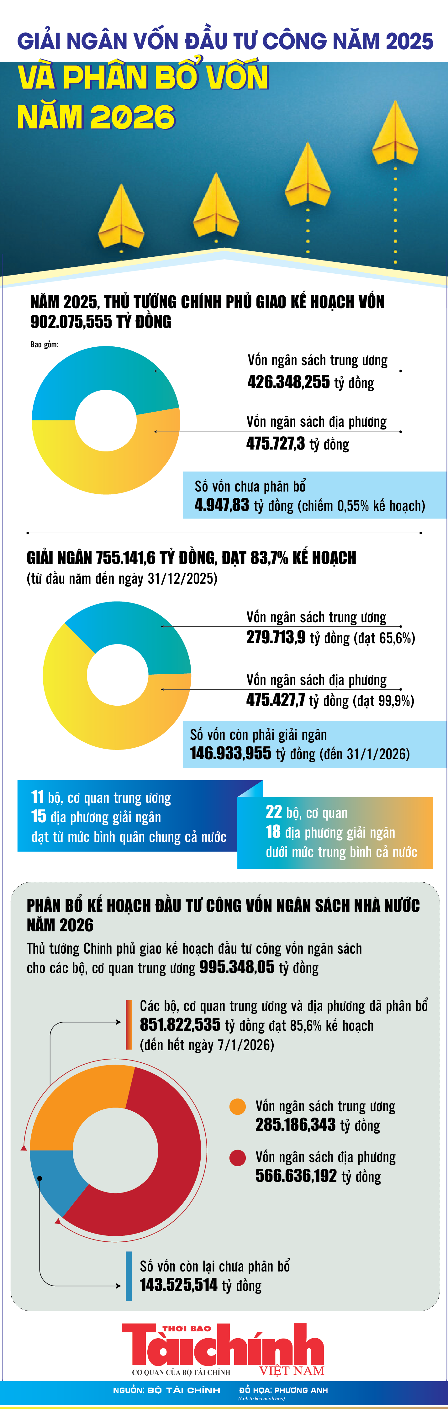 (TBTCO) - Theo báo cáo của Bộ Tài chính, kết quả giải ngân vốn đầu tư công 12 tháng năm 2025 đạt 83,7% kế hoạch. Năm 2026, Thủ tướng Chính phủ đã giao kế hoạch đầu tư công vốn ngân sách nhà nước cho các bộ, cơ quan trung ương 995.348,05 tỷ đồng. Đến hết ngày 7/1/2026, các bộ, cơ quan trung ương và địa phương đã phân bổ 851.822,535 tỷ đồng, đạt 85,6% kế hoạch Thủ tướng Chính phủ giao.