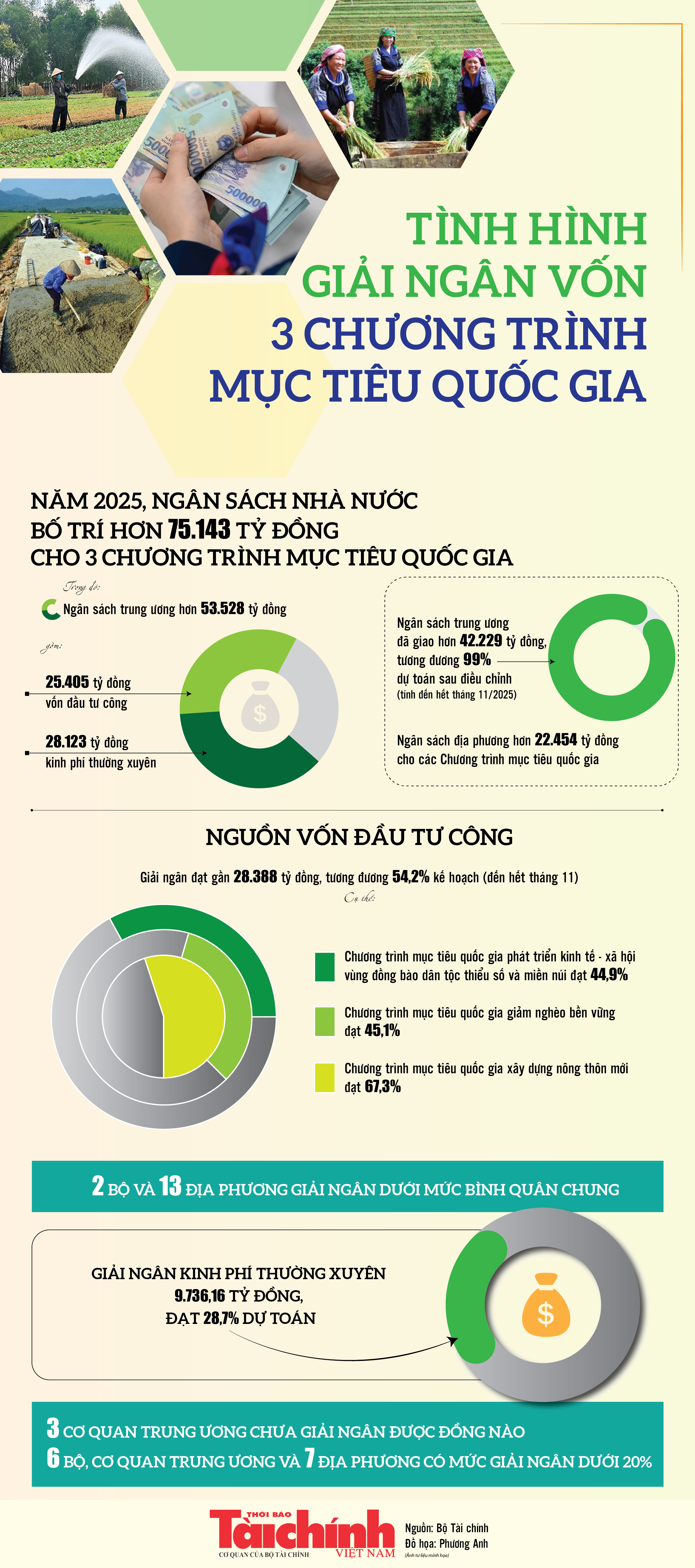 (TBTCO) - Theo Bộ Tài chính, ước giải ngân vốn 3 chương trình mục tiêu quốc gia đến hết tháng 11/2025 đạt gần 28.388 tỷ đồng, tương đương 54,2% kế hoạch năm. Trong đó, Chương trình xây dựng nông thôn mới đạt 67,3%; Chương trình phát triển kinh tế xã hội vùng đồng bào dân tộc thiểu số và miền núi đạt 44,9%; Chương trình giảm nghèo bền vững đạt 45,1%.
