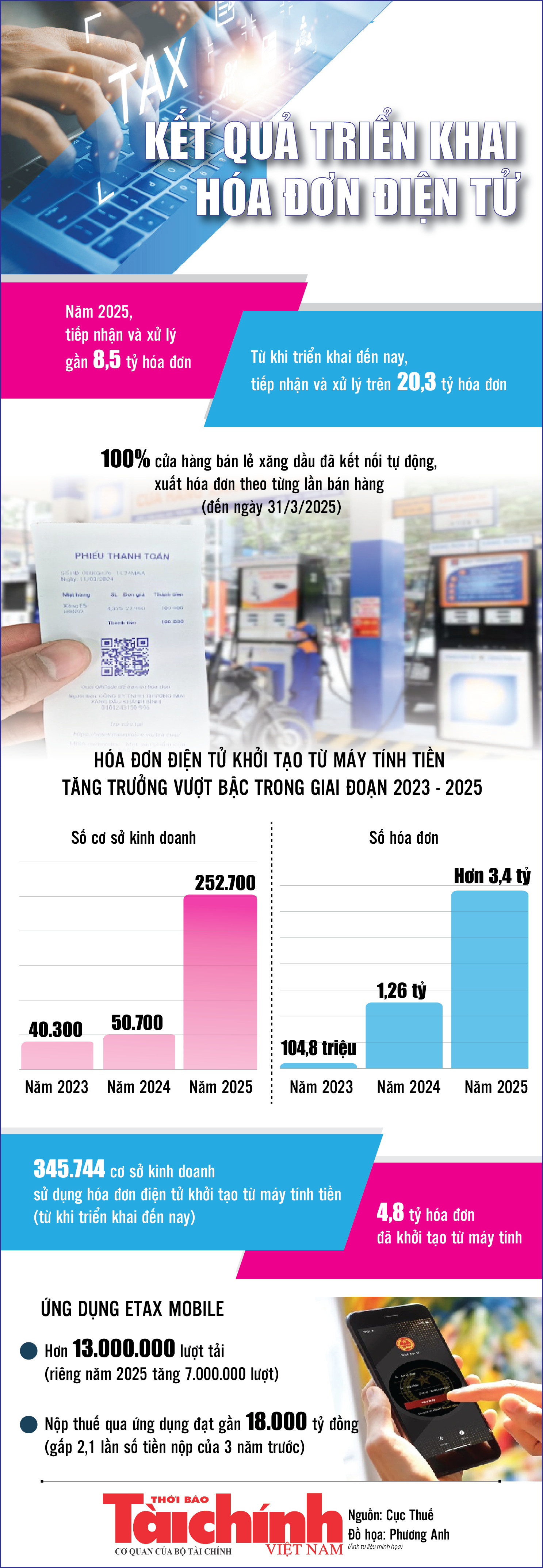 (TBTCO) - Theo Cục Thuế, từ khi triển khai đến nay, hệ thống hóa đơn điện tử vận hành ổn định, lũy kế đã tiếp nhận và xử lý trên 20,3 tỷ hóa đơn. Riêng năm 2025 tiếp nhận gần 8,5 tỷ hóa đơn.