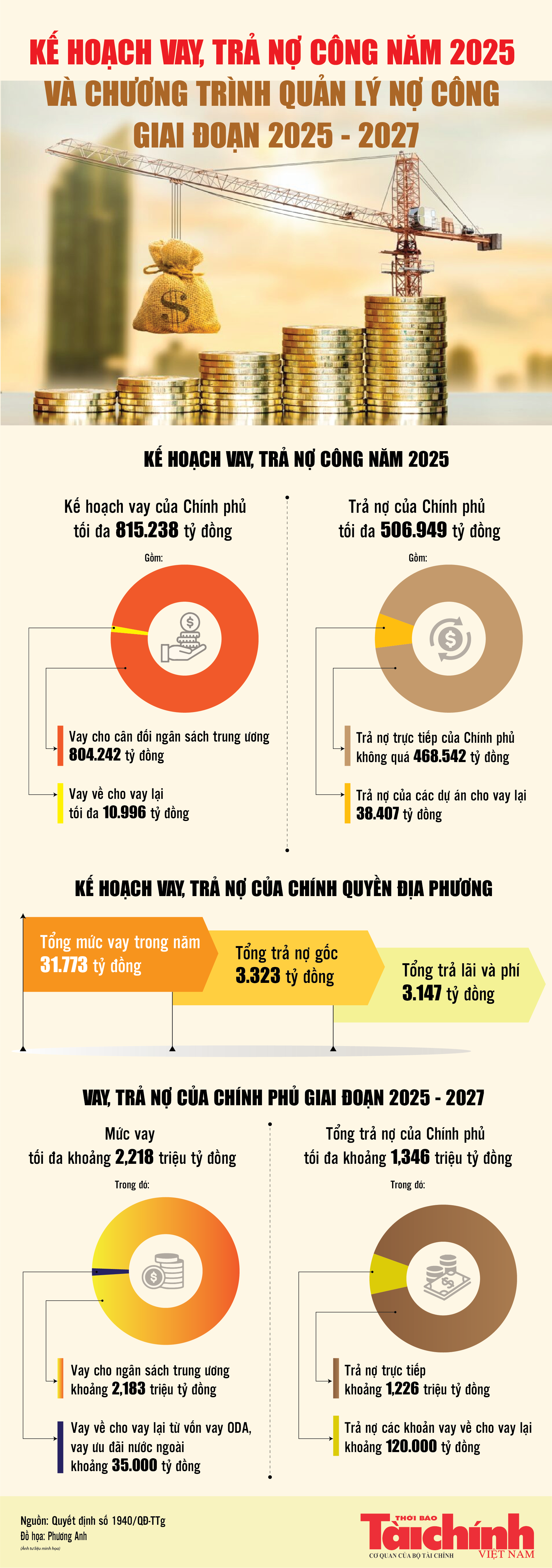 (TBTCO) - Phó Thủ tướng Hồ Đức Phớc vừa ký Quyết định số 1940/QĐ-TTg ngày 8/9/2025 phê duyệt Kế hoạch vay, trả nợ công năm 2025 và Chương trình quản lý nợ công 3 năm giai đoạn 2025 - 2027.