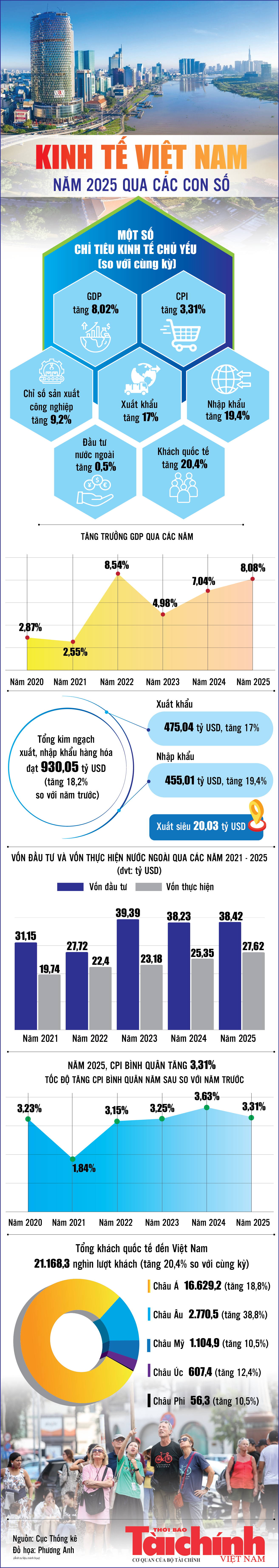 (TBTCO) - Theo số liệu của Cục Thống kê (Bộ Tài chính), năm 2025, nền kinh tế thể hiện khả năng phục hồi kiên cường. GDP tăng trưởng khá với mức tăng ước đạt 8,02% so với năm trước; chỉ số giá tiêu dùng tăng 3,31%; xuất, nhập khẩu hàng hóa tăng 18,2%; chỉ số sản xuất công nghiệp tăng 9,2%... là những con số nổi bật trong năm 2025.