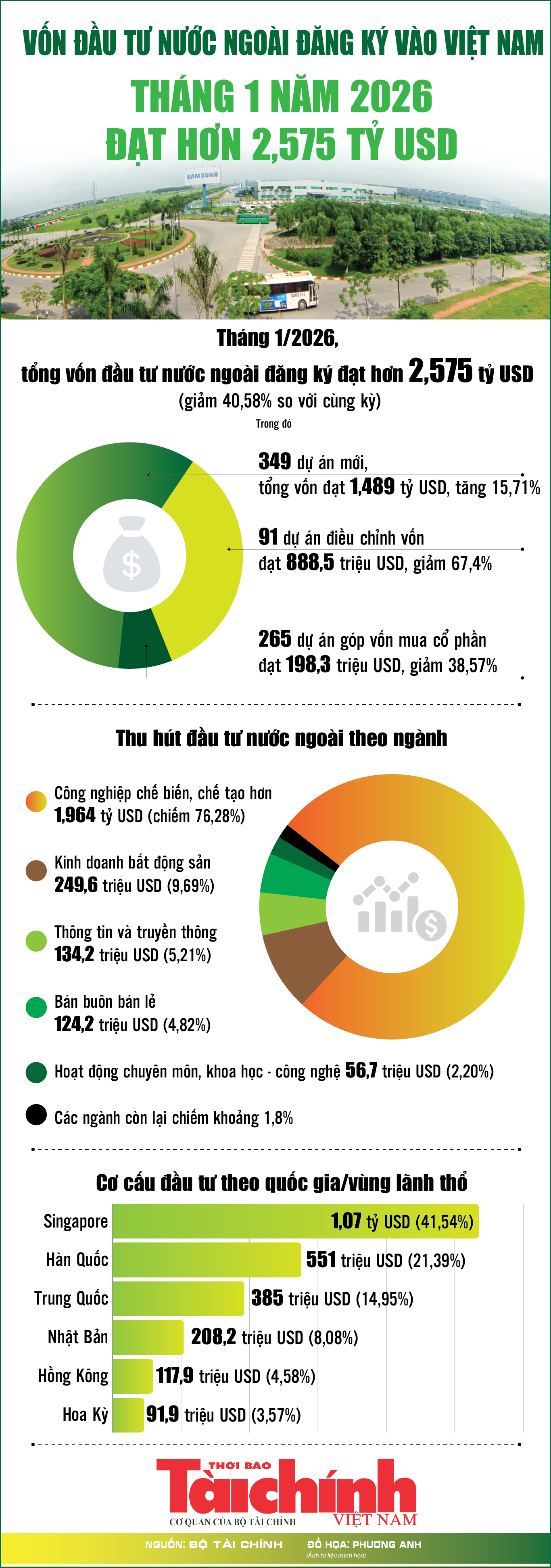 Infographics: Tháng 1/2026, vốn đầu tư nước ngoài đăng ký vào Việt Nam đạt hơn 2,575 tỷ USD