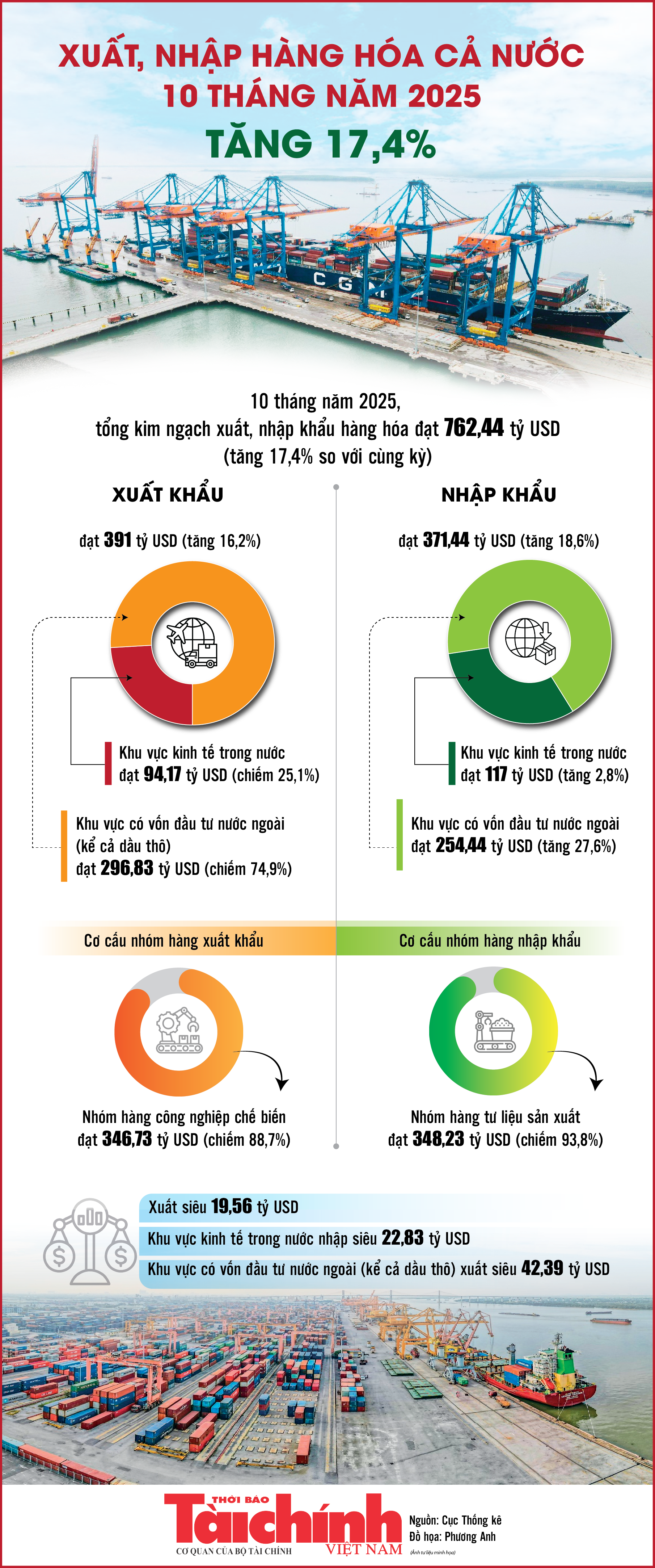 (TBTCO) - Theo Cục Thống kê, 10 tháng năm 2025, quy mô kim ngạch xuất, nhập khẩu cả nước đạt 762,44 tỷ USD, tăng 17,4% so với cùng kỳ năm trước. Trong đó, xuất khẩu tăng 16,2%; nhập khẩu tăng 18,6%. Cán cân thương mại hàng hóa xuất siêu 19,56 tỷ USD.