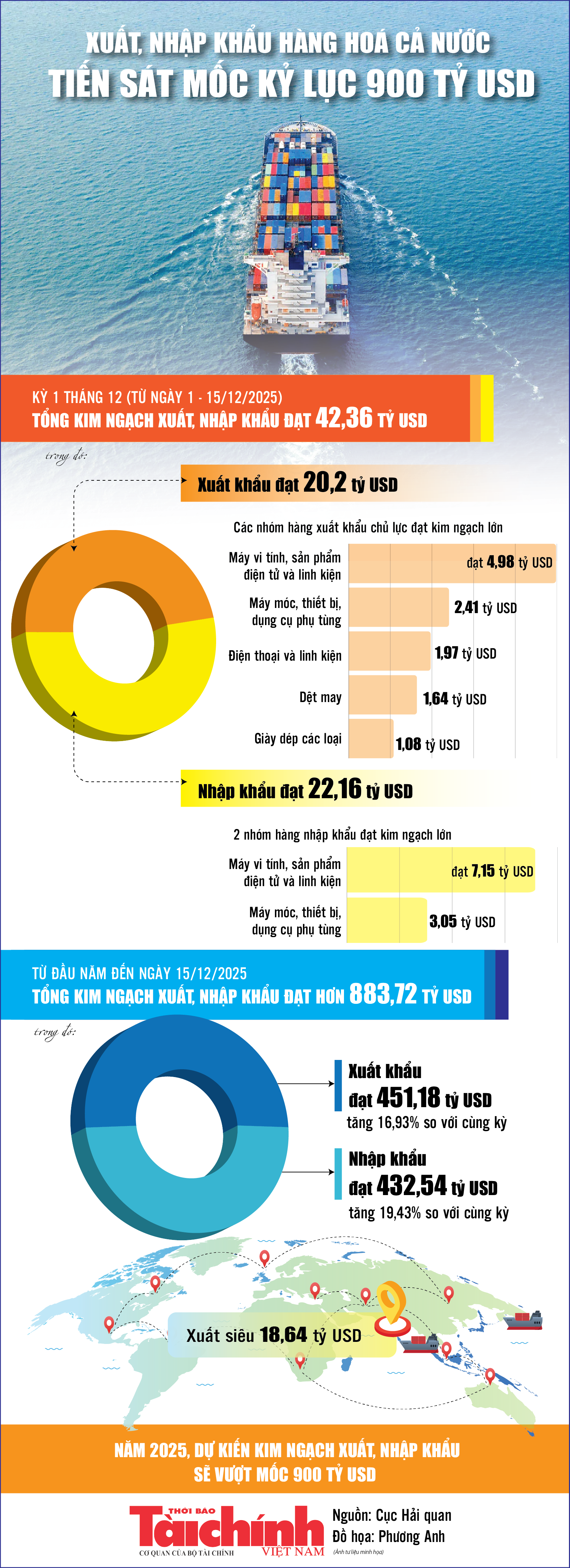 (TBTCO) - Theo Cục Hải quan, tính từ đầu năm đến 15/12/2025, quy mô kim ngạch xuất, nhập khẩu cả nước đạt 883,72 tỷ USD, gần cán mốc kỷ lục 900 tỷ USD. Trong đó, xuất khẩu đạt 451,18 tỷ USD; nhập khẩu đạt 432,54 tỷ USD; cán cân thương mại thặng dư 18,64 tỷ USD.