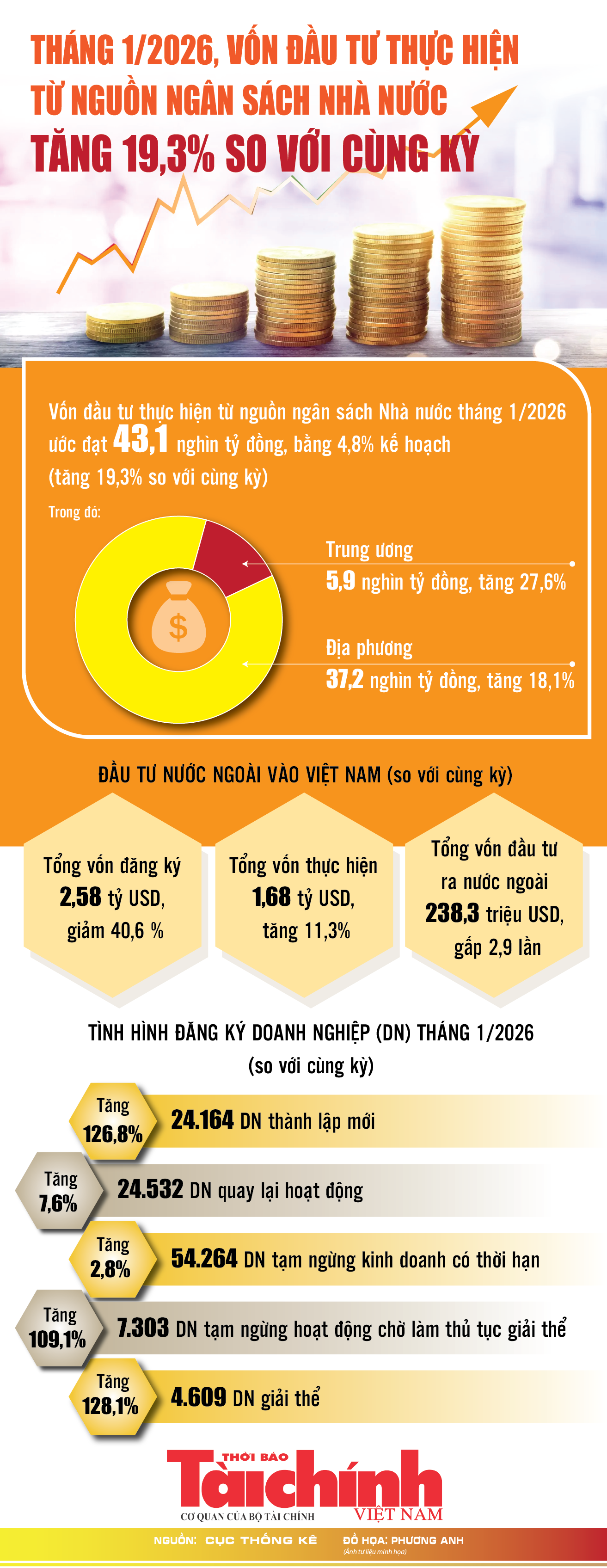 Infographics: Vốn đầu tư thực hiện từ nguồn ngân sách nhà nước tháng 1/2026 ước đạt 43,1 nghìn tỷ đồng