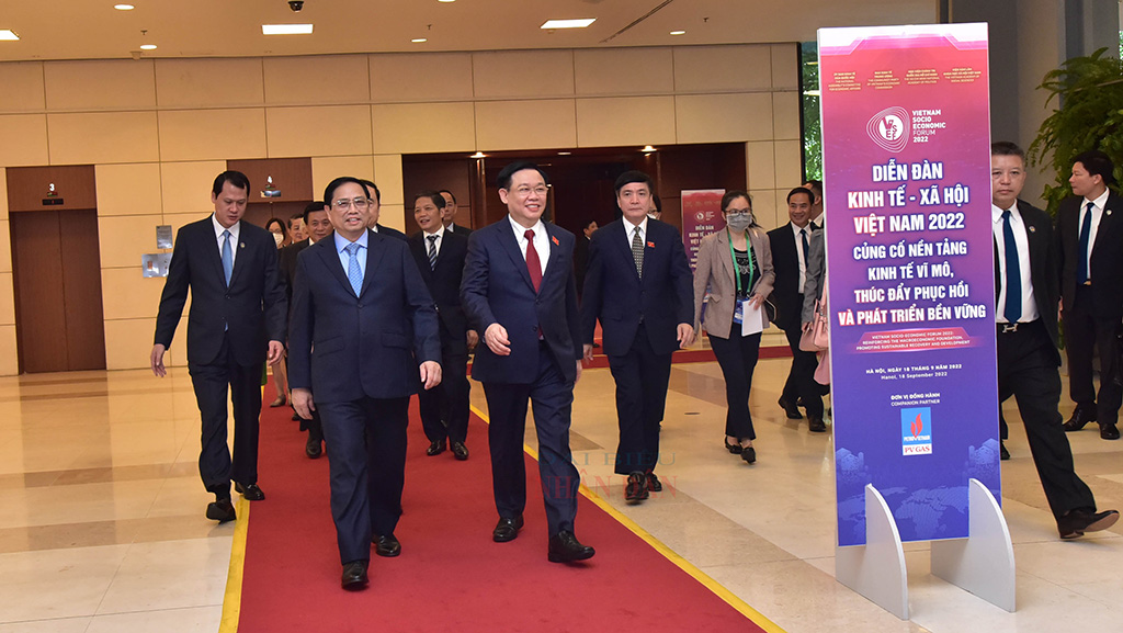 | Thủ tướng Chính phủ Phạm Minh Chính, Chủ tịch Quốc hội Vương Đình Huệ và các đại biểu dự Diễn đàn Kinh tế - Xã hội Việt Nam 2022. Ảnh: Lâm Hiển |